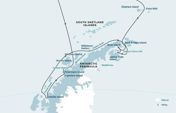This expansive expedition takes you into the Antarctic Circle, combining the rich animal life of the Weddell Sea with the surreal shores and islands of the Antarctic Peninsula. Such key landing sites as the legendary Elephant Island and Crystal Sound make this voyage truly exceptional.